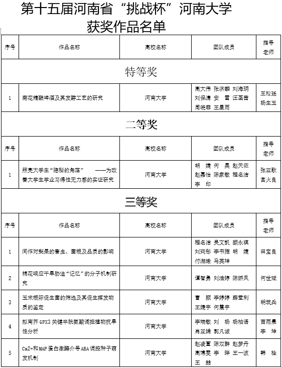 近日,由团省委、省教育厅、省科协、省学联联合主办的第十五届河南省“挑战杯”大学生课外学术科技品竞赛评选结果揭晓,经过激烈的网络初评、复赛评审、终审答辩等环节,必赢官网取得特等奖1项、二等奖1项、三等奖5项的优异成绩。其中,王松廷、杨生玉老师指导,高大伟、张济麟等同学参与的“菊花精酿啤酒及其发酵工艺的研究”项目获得特等奖,并代表河南省参加全国总决赛。充分展示了必赢官网青年学子的思考力、创造力、实践力,更显示了必赢官网在大学生创新创业教育、人才培养方面的实力。