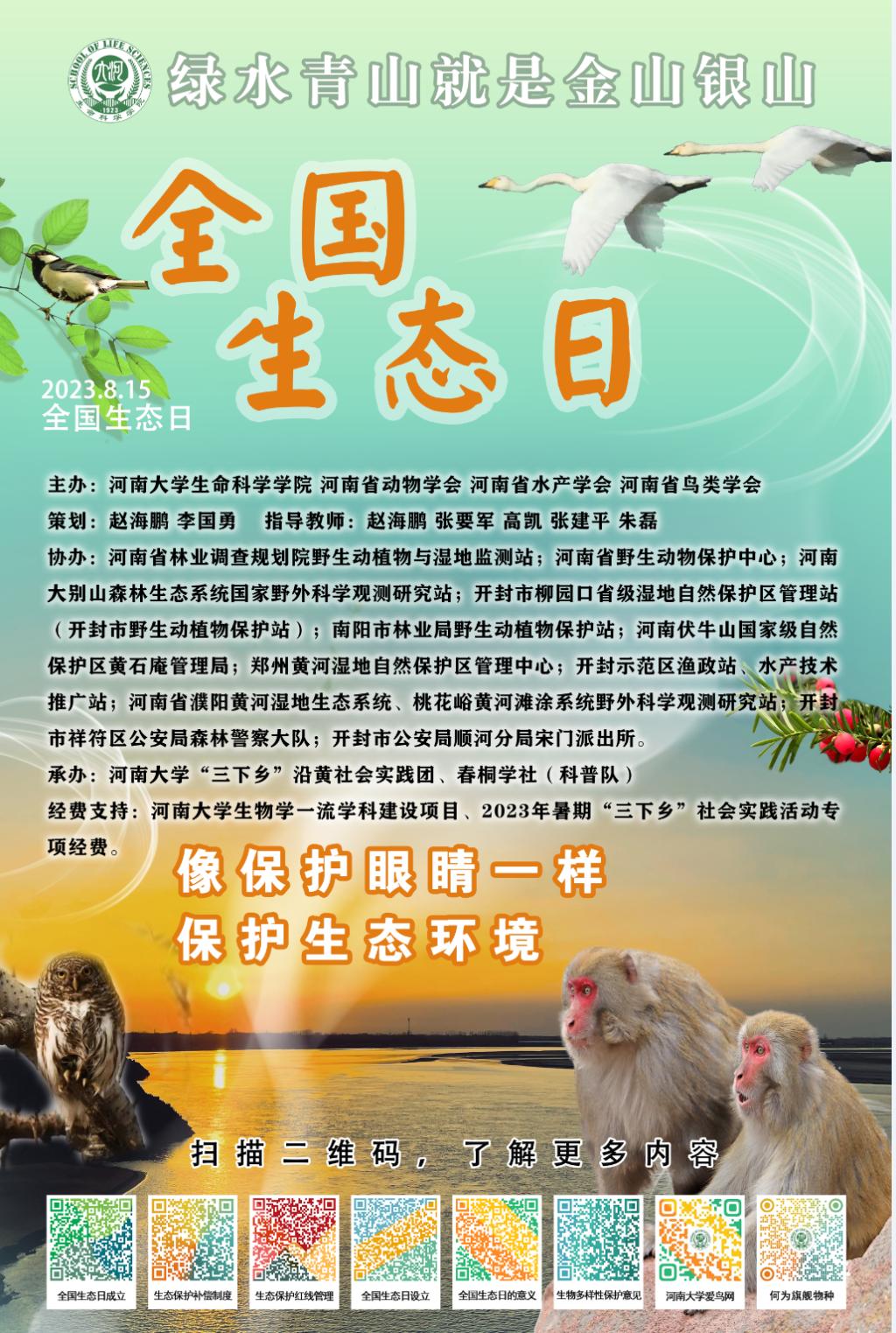 为迎接首个全国生态日(8月15日),必赢76net线路官网提早准备,精心安排,近日来,围绕“绿水青山就是金山银山”主题开展了科普宣讲、海报张贴和文创产品分发等系列活动,场所除必赢76net线路官网校园外,还包括开封柳园口省级湿地自然保护区、开封市水稻乡杨桥社区、沙门村以及开封市中国式摔跤协会运动训练基地等,并在“2023河南省动物学会教学科研研讨会”上介绍了科普活动产品和方案,得到了来自27家参会单位80余参会嘉宾、代表的高度肯定和认可。