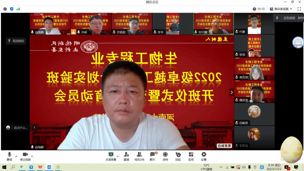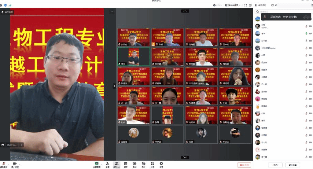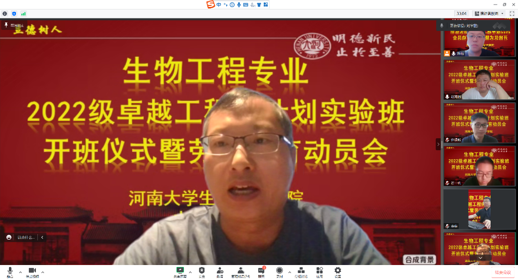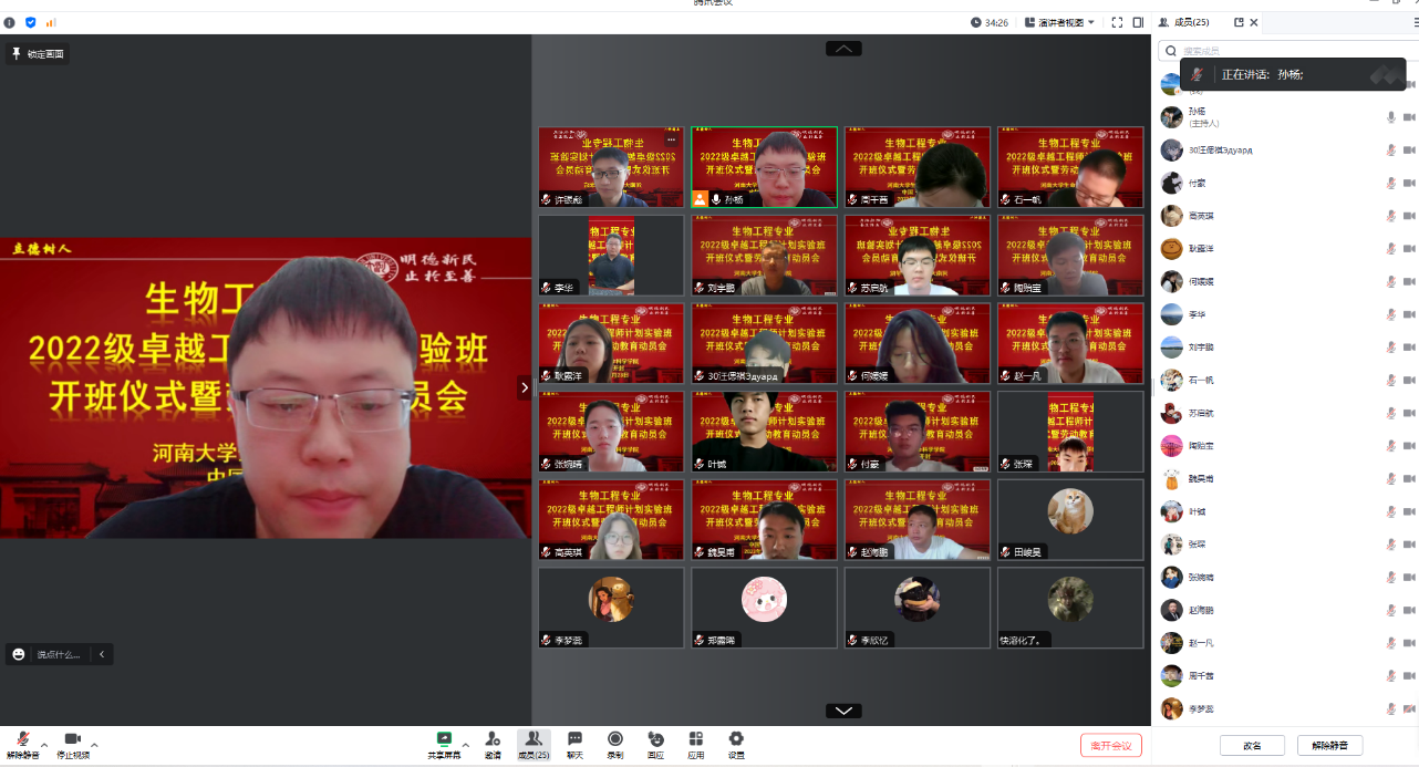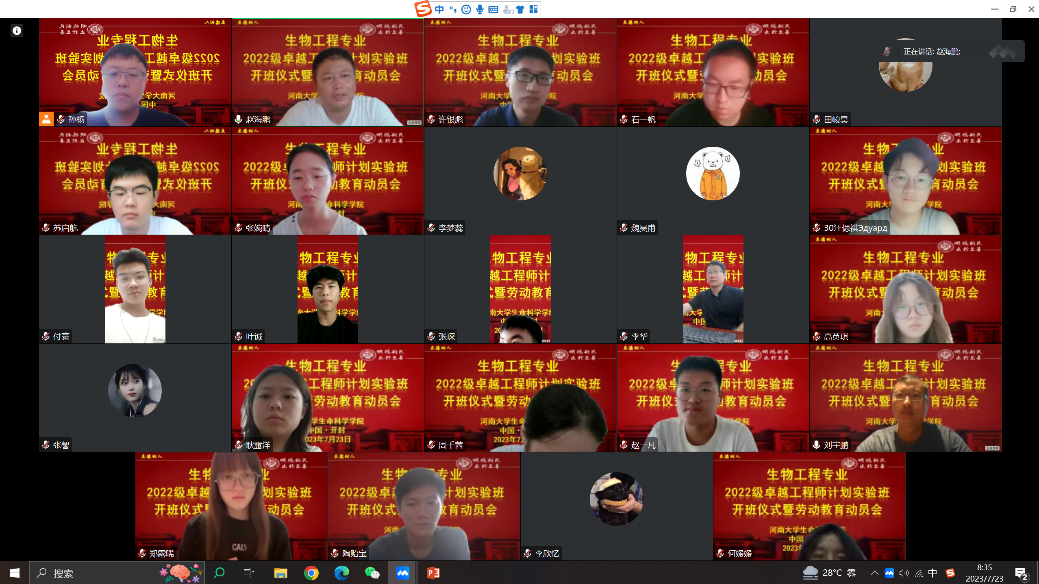 7月22日,新一届生物工程专业2022级卓越工程师计划实验班(卓工班)开班仪式暨劳动教育动员会顺利举行。学院副院长赵海鹏、生物工程系主任刘宇鹏、副主任李华、卓工班班主任孙杨和许银彪以及卓工班同学在线上齐聚一堂参加活动,会议由孙杨主持。