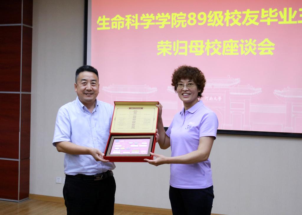 89级校友向学院捐赠纪念汴绣,祝愿学院勇攀高峰,取得更大成就。吴建伟代表学院向89级校友送上必赢76net线路官网校徽套装,寄托了母校对大家诚挚的祝福。