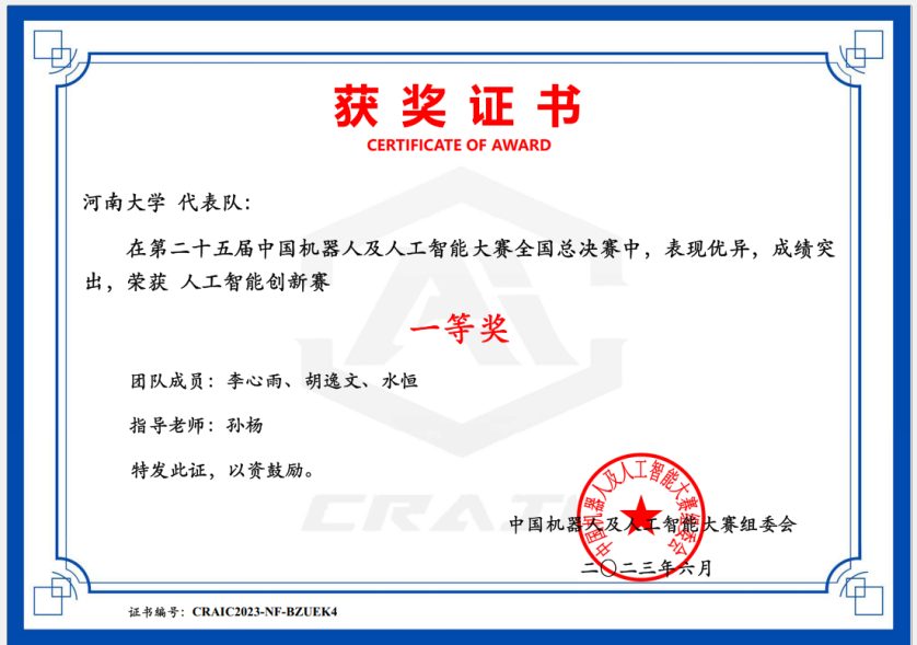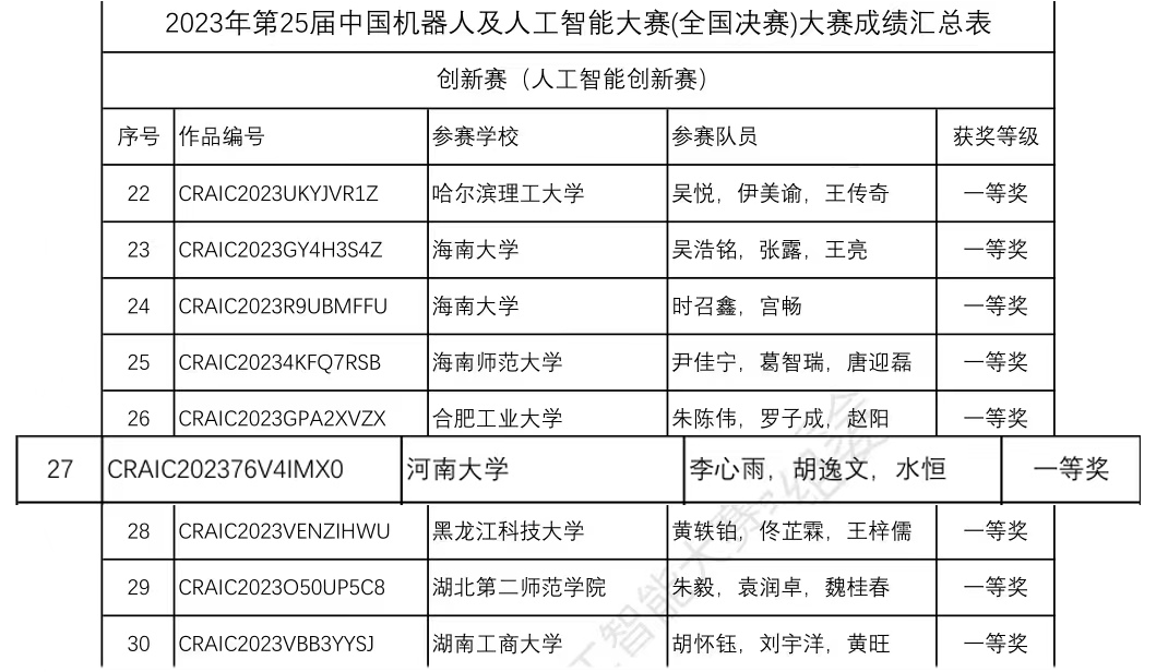 近日,由中国人工智能学会主办的第二十五届中国机器人及人工智能大赛全国总决赛圆满闭幕。来自全国300多所高校共800多支队伍参加了本次比赛,展示了前沿的机器人、人工智能技术,在线上线下展开对决。经过激烈角逐,必赢官网团队在孙杨老师的指导下攻坚克难,斩获全国总决赛一等奖1项,河南赛区总决赛三等奖1项。
