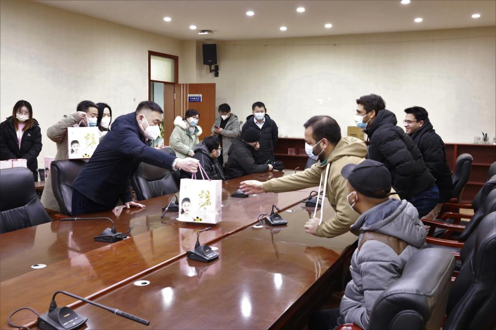 每到一处,学院领导都会为同学们送上新年大礼包,并致以节日问候和新年祝福,询问同学们当前留校生活情况和科研进展情况,表扬同学们的刻苦努力,感谢他们为学科建设的辛勤付出。随后,学院领导在B201会议室为国际留学生代表一一发放新春礼包,向他们热情地介绍了中国传统文化,希望他们身在异乡,情连河大,在开封度过美好难忘的新春佳节。