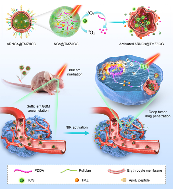 GBM作为中枢神经系统最常见的原发肿瘤,约占颅内恶性肿瘤总发病率的40%。现阶段GBM治疗效率不佳的主要原因在于血脑屏障(BBB)的存在及药物难以在深度肿瘤组织积累。针对上述问题,实验室构建了近红外可激活的仿生纳米凝胶药物 ARNGs@TMZ/ICG(如下图),可通过近红外照射激活负载的光敏剂ICG,触发纳米凝胶形变及药物释放,实现BBB有效穿越及药物在肿瘤组织深度渗透,最终实现胶质瘤的高效治疗。
