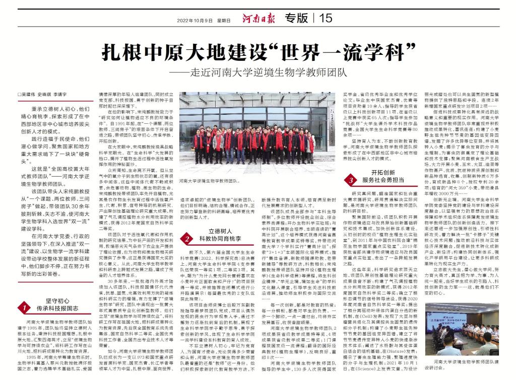 必赢76net线路官网逆境生物学教师团队始建于1985年,团队始终坚持立德树人根本任务,秉持科技报国理想,扎根中原大地,汇聚四海英才,立足“逆境生物学与可持续农业”,将科研工作写在山川大地,把科研成果转化为教育资源。