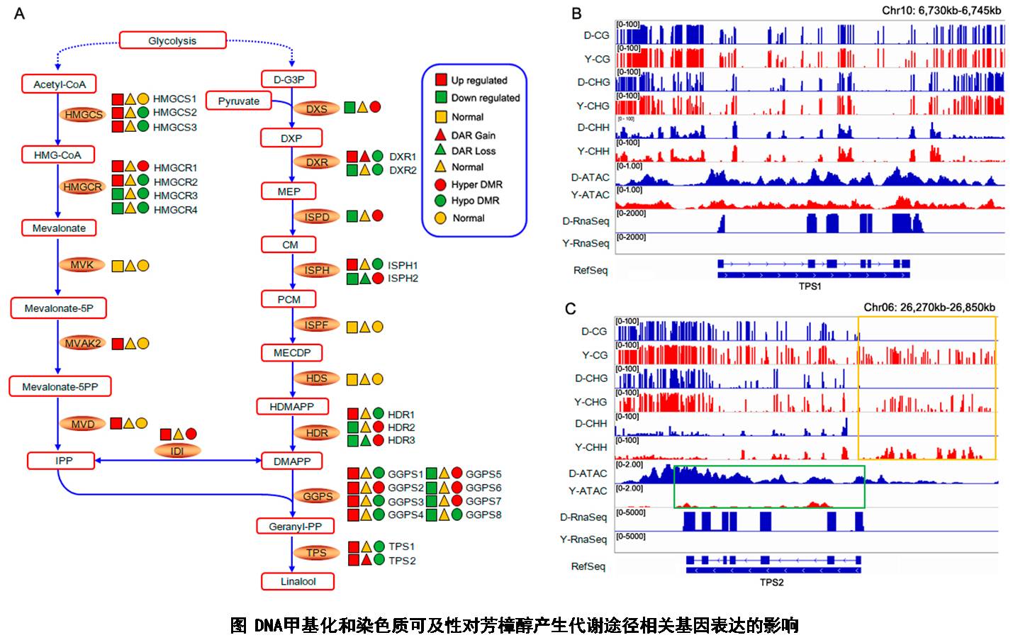 该研究利用全基因组甲基化测序技术和ATAC-Seq技术对桂花银桂品种‘Zaohuang’和丹桂品种‘Chenghong Dangui’的基因组DNA甲基化状态和染色质的开放性进行分析。结果表明,芳樟醇产生的关键基因TPS2的启动子区域,在丹桂中的甲基化程度远低于银桂,染色质开放程度远高于银桂,所以导致该基因在丹桂中表达量远高于银桂,最终导致丹桂花瓣中含有大量的芳樟醇及其氧化物,而银桂花瓣中含量较少。ATAC-Seq分析结果表明,在丹桂花瓣中TPS2基因转录起始位点上游的染色质开放区域,存在多个bHLH转录因子结合位点。结合转录组分析、双荧光素酶实验和EMSA实验等,发现bHLH35可能参与了TPS2基因表达的调控,最终影响了芳樟醇及其氧化物的合成。