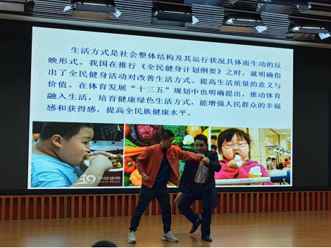 在互动环节,洪浩与他的研究生现场示范了太极常见交手动作和实例讲解太极的运动内涵。向大家推荐难度系数低,强身健体效果好的“八段锦”,全体师生起身跟随洪老师认真学习八段锦的动作要领,在实践中感受传统运动的魅力所在。最后,洪老师倡议大家在学习工作之余,要养成锻炼身体的好习惯,动静结合,培养健康体魄,激发创新源泉。