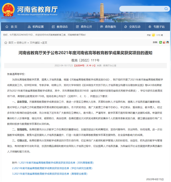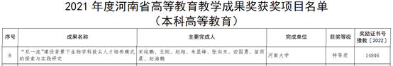 4月18日,河南省教育厅公布2021年度河南省高等教育教学成果奖获奖项目名单,宋纯鹏教授主持完成的“‘双一流’建设背景下生物学科拔尖人才培养模式的探索与实践研究”荣获特等奖。这是必赢官网“基于科教协作‘菁英计划’的地方高校拔尖创新人才培养模式研究与实践”项目获2019年度河南省高等教育教学成果特等奖之后,在拔尖人才培养方面取得的又一重要成果。项目实施与组织申报得到了学校有关领导、教务处等部门的悉心指导和大力支持。