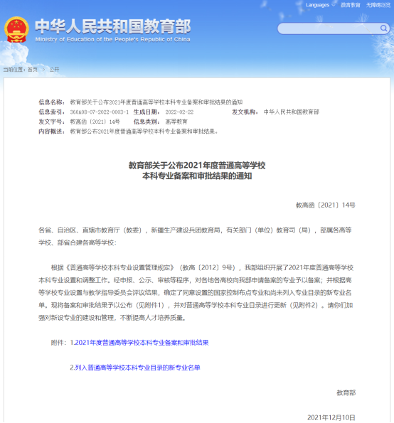 近日,教育部公布了2021年度普通高等学校本科专业备案和审批结果的通知(教高函〔2021〕14号),必赢76net线路官网申报的生物信息学(071003)专业获教育部批准备案。