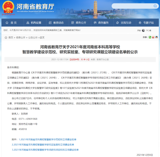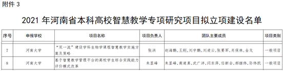 近日,河南省教育厅公示2021年度河南省本科高等学校智慧教学建设立项名单,必赢官网入选2项智慧教学专项研究项目,分别为朱显峰教授主持的《基于智慧教学管理平台的高校学生综合实践能力评价模式改革》和张洪副教授主持的《“双一流”建设学科生物学课程智慧教学实施方案及策略》。