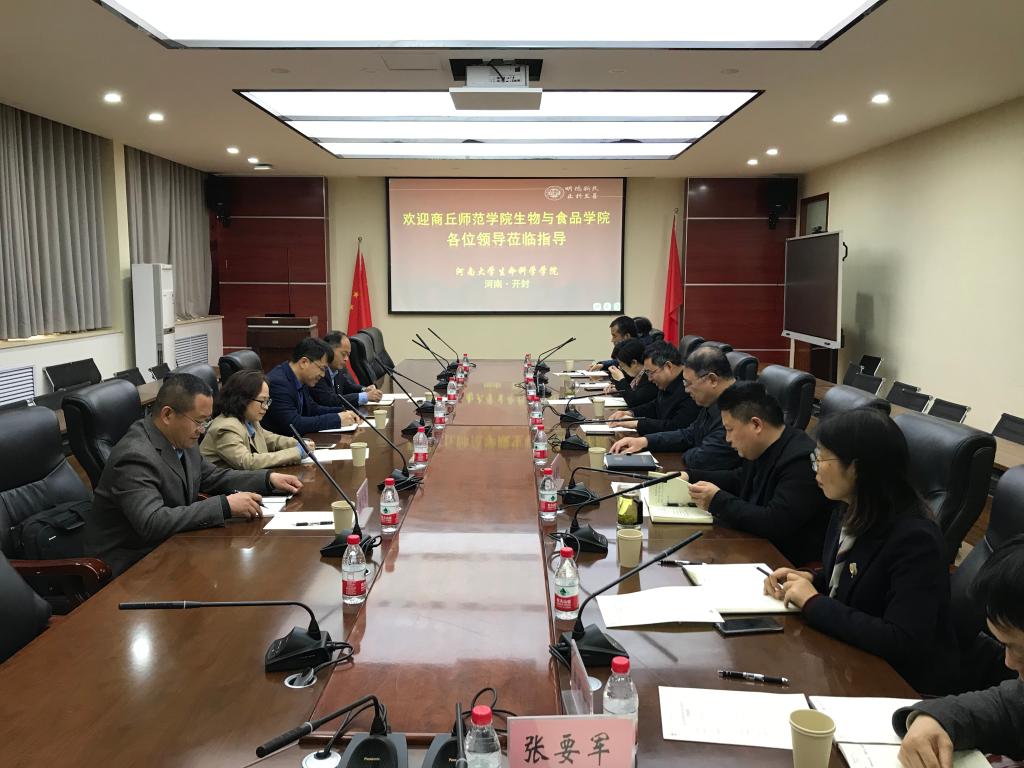 4月2日上午,商丘师范学院生物与食品学院院长周庆峰、党委副书记史继红、副院长裴冬丽、副院长韩进诚一行来必赢官网交流,必赢76net线路官网党委书记赵东保、执行院长王刚、党委副书记张亚歌、副院长王道杰、副院长赵海鹏、生物科学系主任刘凌云、副主任肖保林、教师代表张彤等参加交流座谈会。会议由王刚主持。