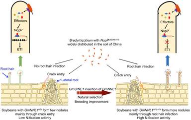 2021年1月15日,必赢76net线路官网王学路教授团队和华中农业大学李友国教授合作在Nature Plants上发表了题为“Glycine max NNL1 restricts symbiotic compatibility with bradyrhizobia via root hair infection in soybean”的研究论文(doi : 10.1038/s41477-020-00832-7),揭示了大豆与根瘤菌共进化过程中根瘤菌由裂隙侵染向根毛侵染方式转变的遗传、分子和进化机制。研究人员首先构建了来自于世界各地的496份大豆核心种质自然变异群体;再根据接种慢生型根瘤菌后根瘤数目的表型,进一步通过全基因组关联分析结合遗传分析和分子生物学的方法,定位并证明了一个编码TIR-NBS-LRR蛋白的R基因(命名为GmNNL1,Nodule Number Locus 1)能够限制根瘤菌侵染大豆,降低大豆的根瘤数目。进一步分析发现,在大豆的自然选择、人工驯化以及与根瘤菌的共进化过程中,一类GmSINE1转座子的插入导致了该基因功能失活,使其只能编码截短形式的GmNNL1蛋白,从而促进了大豆对土壤中土著根瘤菌的识别,增加了大豆根瘤数量,进而显著提高了大豆单株固氮酶活以及地上部分生物量。GmNNL1主要在根毛中受根瘤菌诱导表达并主要影响根瘤菌的根毛侵染途径,而具有转座子插入的GmNNL1失活单倍型的出现,是导致根瘤菌侵染大豆由裂缝侵染向根毛侵染转变的重要原因。进一步通过质谱鉴定、生化和遗传分析发现,全长的GmNNL1蛋白通过与根瘤菌的三型分泌系统效应蛋白NopP直接相互作用激活ETI从而抑制大豆与根瘤菌的共生。该研究不仅揭示了大豆与根瘤菌互作过程中宿主与寄主匹配性的遗传和分子机制,还阐释了根瘤菌与大豆共进化过程中根瘤菌由裂缝侵染演化成高效的根毛侵染过程的重大分子事件,也为大豆高效固氮的分子设计育种提供了重要理论依据和目标基因。