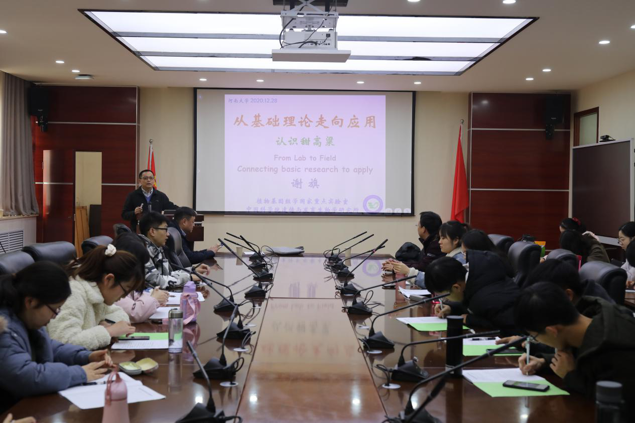 2020年12月28日上午,总第175期、2020年第13期“生物学前沿学术交流研讨会”(Biology cutting-edge Academic Exchange Seminar,简称“BAES”)在生科院B201举行。中科院遗传与发育研究所,特聘教授,国家杰出青年基金获得者谢旗应邀在此作题为“从基础理论走向应用-认识甜高粱”的学术报告。来自必赢76net线路官网生物学的研究生聆听了报告。报告会由张立新老师主持。
