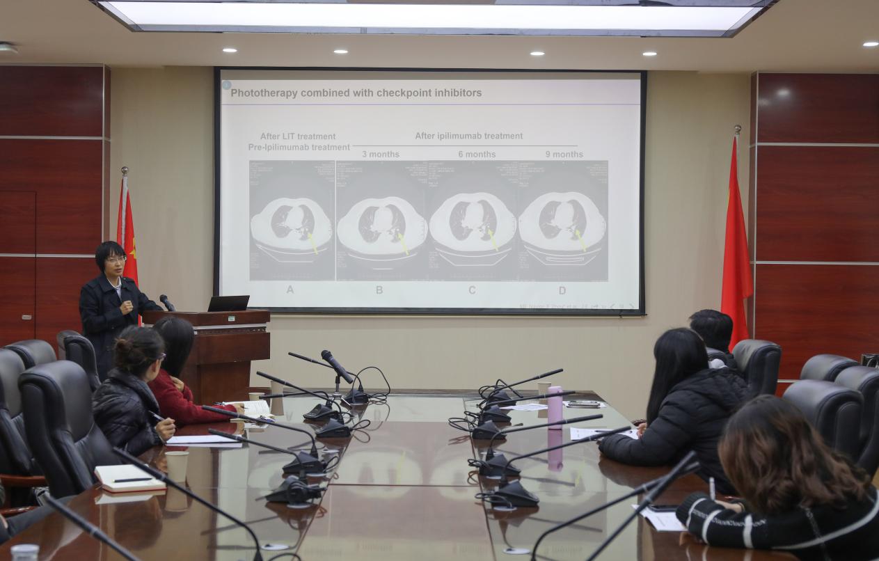 周非凡教授以肿瘤发生机理、研究进展、治疗方法为线索,巧妙地引出光免疫治疗肿瘤这一新进展。她还与现有肿瘤治疗技术如化疗、手术、放疗等一一进行比较,突显了光免疫疗法深远的前瞻性。随后周非凡教授向我们展示了一些目前光免疫治疗的器械,吸引了在座同学们的学习兴趣。报告会结束以后,周非凡教授还和在座的老师和同学们进行了一系列相关问题的讨论, 学术氛围十分浓厚。
