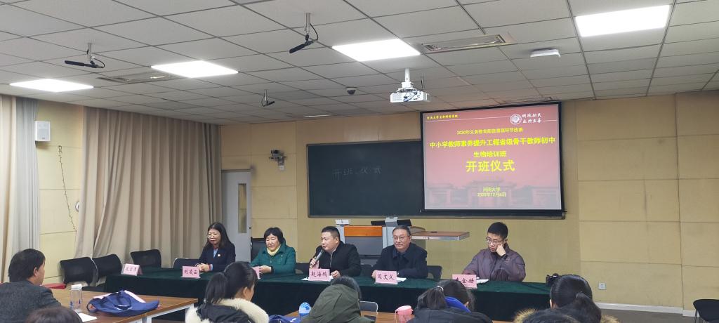 2020年12月6日,2020年义务教育师资薄弱环节改善中小学教师素养提升工程省级骨干教师初中生物学培训班开班仪式在必赢76net线路官网举行,来自全省各地的培训班学员50名,学院副院长赵海鹏、成人教育办公室主任李黎、生物科学系主任刘凌云、培训班课程安排负责人闫文义等出席开班仪式,仪式由闫文义主持。