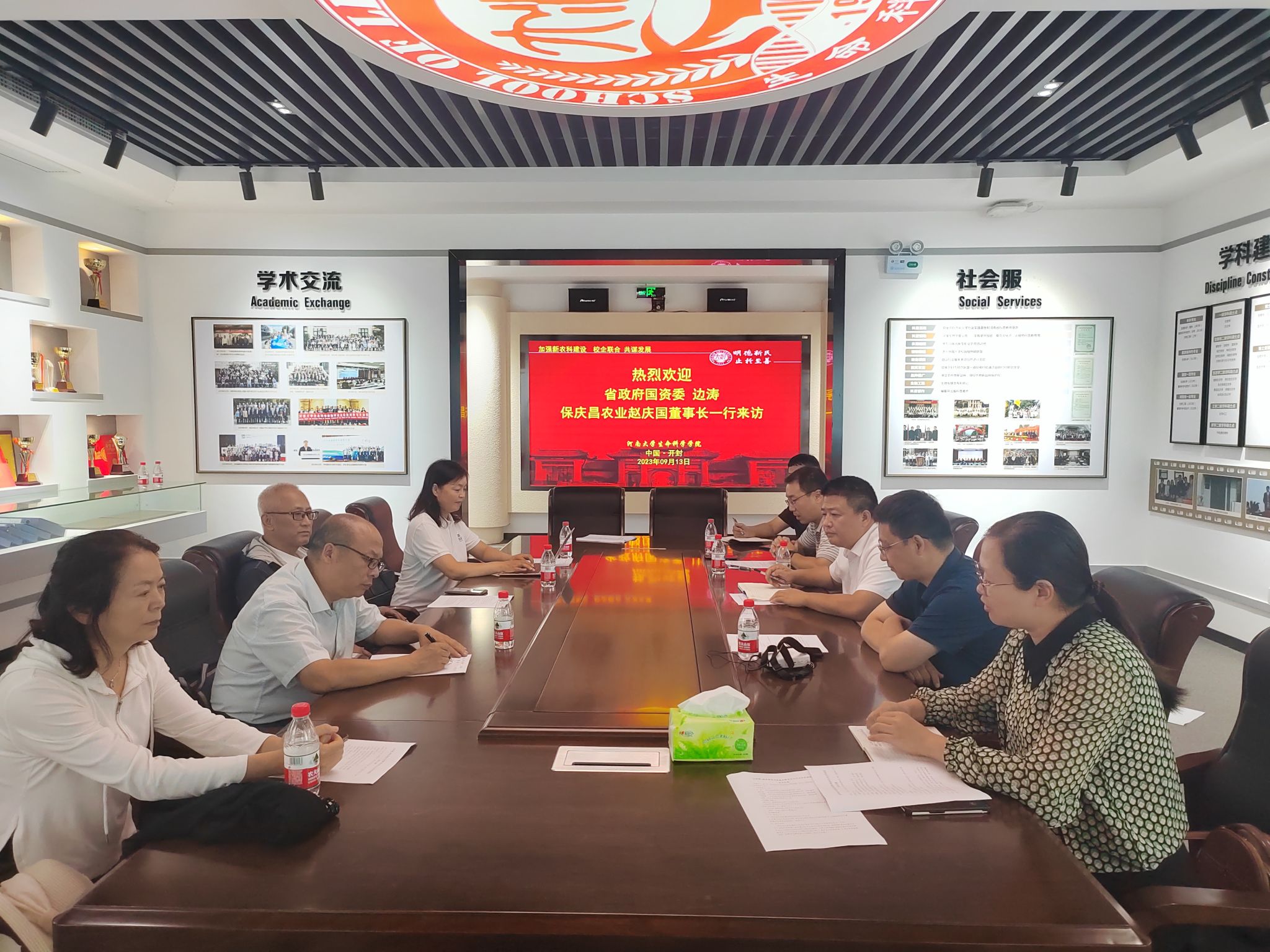 赵海鹏介绍了学院的基本情况和一流学科相关建设成就。他表示,学院积极学习贯彻习近平总书记给全国涉农高校书记校长和专家代表重要回信精神,主动履行社会服务职责,发挥专业优势服务地方经济;贯彻新农科建设理念,加强与地方政府和涉农企事业单位的合作,培养好农科人才,并以此为媒介促进了解,共同发展,从农业生产一线找题目研究并将成果回馈应用于生产实践,将论文写在祖国大地,在实践中提升人才培养尤其农科人才培养质量。边涛感谢必赢官网的热情接待,介绍了河南省孟楼村的村情、“驻村书记”的职责和使命,希望必赢官网发挥人才和科研优势,助力孟楼村的乡村振兴和保庆昌农业发展有限责任公司的发展壮大。周海燕代表公司介绍了目前的产业经营现状和面临的挑战,欢迎学院师生前往考察参观、开展实习和劳动教育,同时希望在技术方面得到学院的帮助和支持。